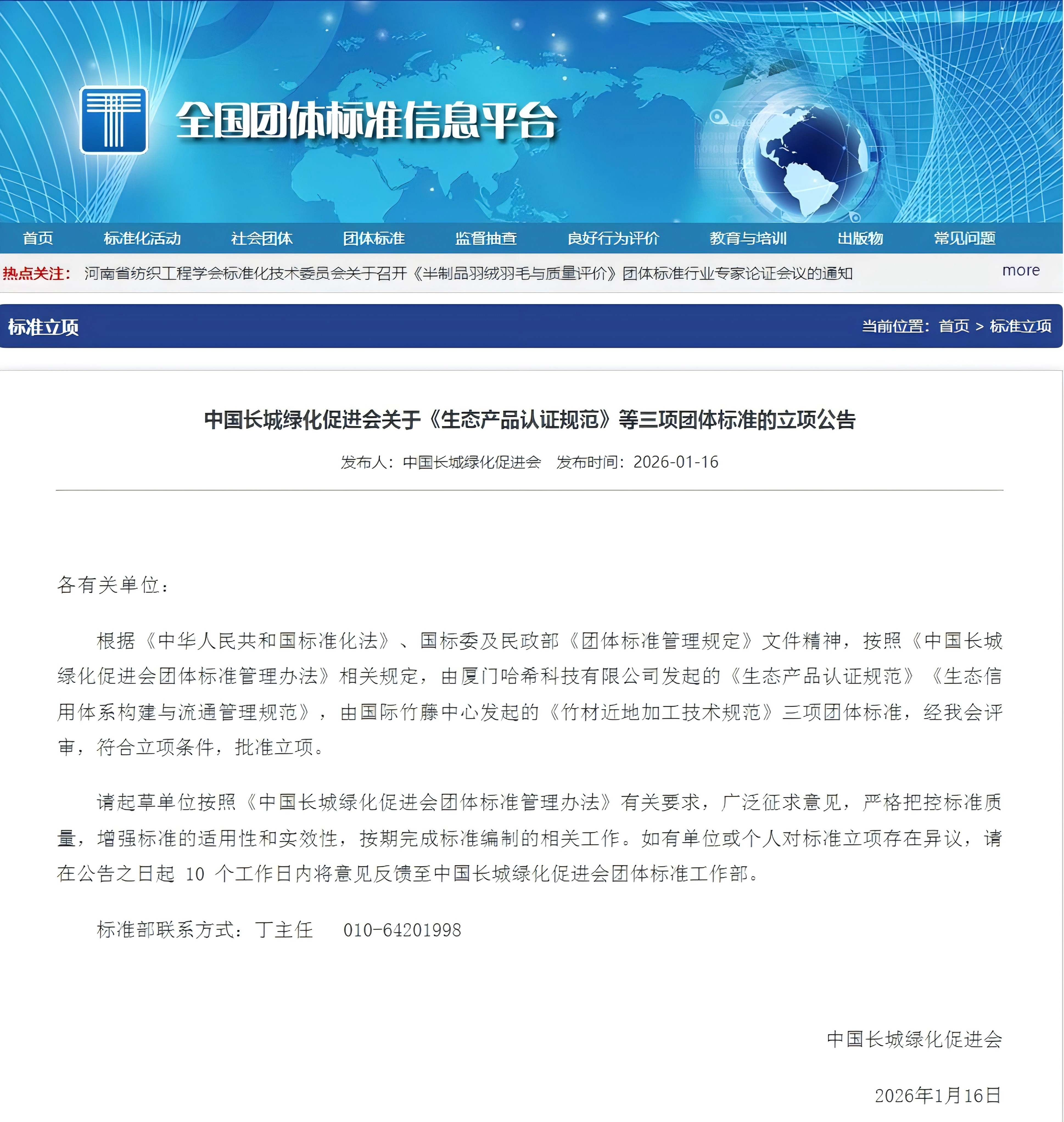 近日,中国绿化长城促进会在全国团体标准信息平台公布了关于《生态产品认证规范》等三项团体标准的立项公告,正式批准由我司发起的《生态产品认证规范》和《生态信用体系构建与流通管理规范》两项团体标准立项。这标志着我司在探索生态产品价值实现的道路上,迈出了从学术理论到行业标准的关键一步。以下是立项公告原文。